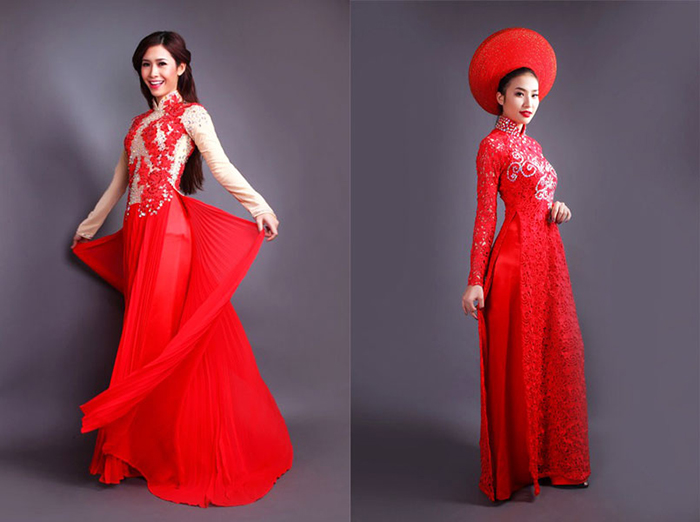 - Kiểu dáng áo dài: Áo dài cưới thường được chia thành 2 dạng cơ bản là áo dài cưới truyền thống và áo dài cưới cách tân. Việc lựa chọn kiểu dáng nào phụ thuộc vào sở thích và phong cách của cô dâu. Đối với cô dâu có bắp tay to thì những chiếc áo dài truyền thống sẽ giúp khéo léo che đi khuyết điểm. Một số mẫu áo dài cách tân thành nhiều tà hoặc tà rộng sẽ giúp những cô dâu gầy trở nên cân đối hơn.